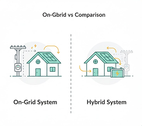 The choice depends on your power usage, budget, and backup requirements. On-grid systems are cost-effective, while hybrid systems offer backup power.
